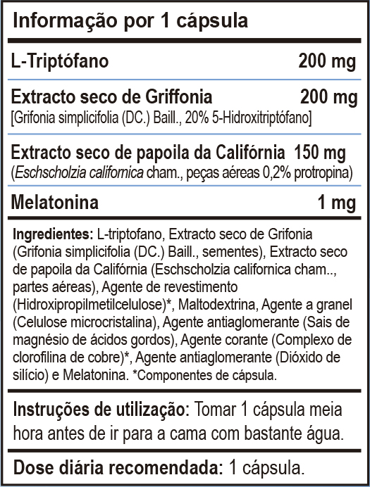 Os suplementos alimentares não devem ser utilizados como substitutos de um regime alimentar variado e equilibrado e de um estilo de vida saudável. Não exceda a dose diária expressamente recomendada. Mantenha fora do alcance de crianças pequenas. Não deve ser consumido por mulheres grávidas, crianças ou por períodos prolongados sem acompanhamento médico. Não consuma se estiver sob tratamento antidepressivo.Ingredientes Completos